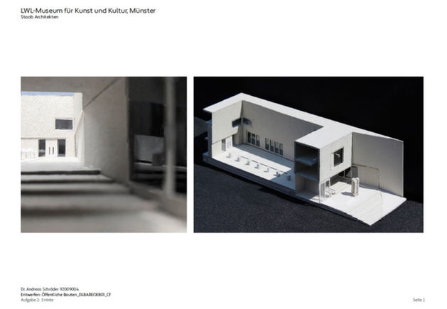 Bei der Planung von öffentlichen Gebäuden ist der Übergang vom öffentlichen Raum in das Gebäudeinnere von zentraler Bedeutung. In der zweiten Aufgabe soll die Zugangssituation der gewählten Referenz aus Auf-gabe 1 räumlich in einem Modell aus Graupappe studiert werden.